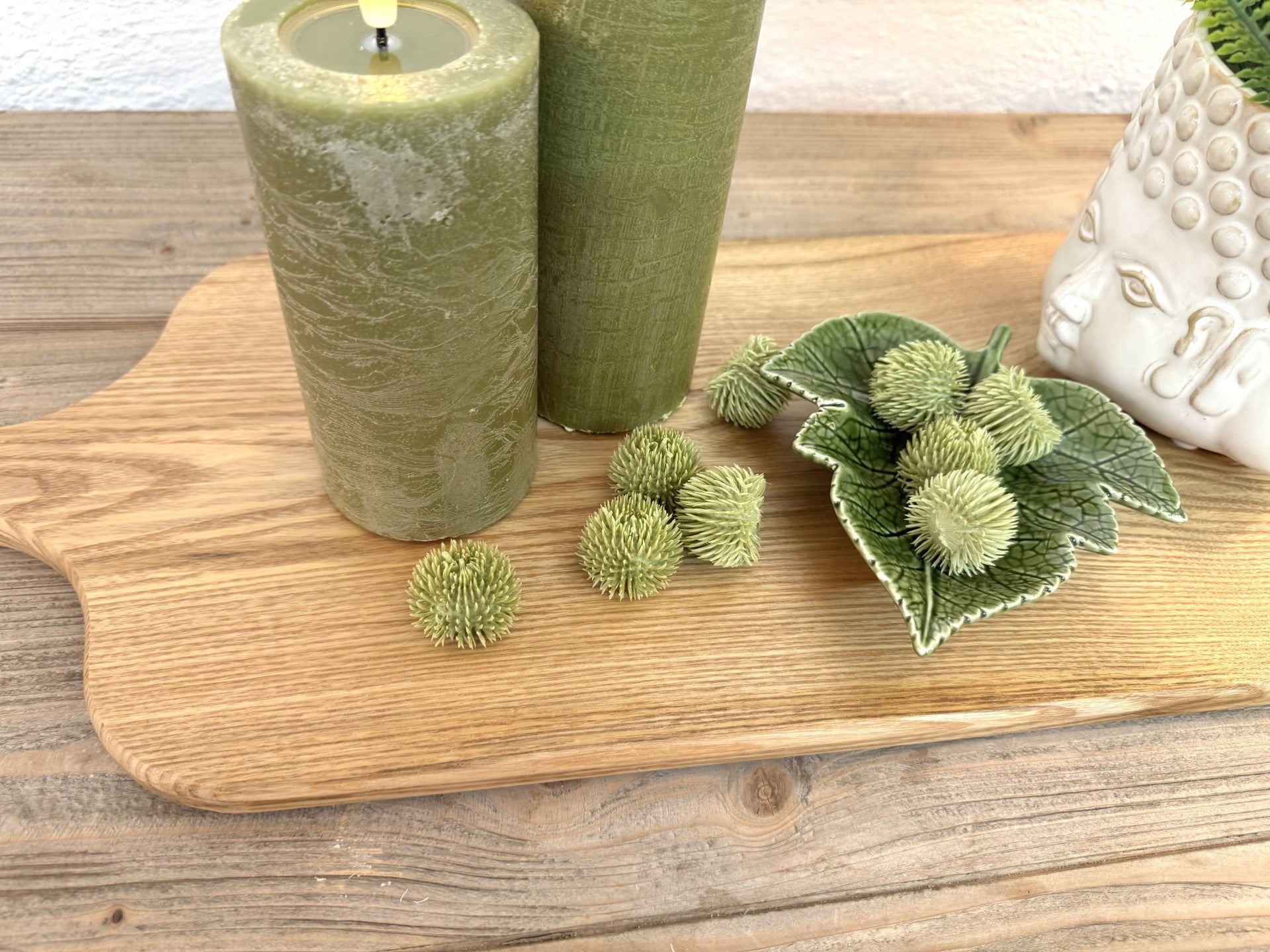 Works well with... Create a focal point for your dining table with moss candles, Buddha bowl and echinop balls.